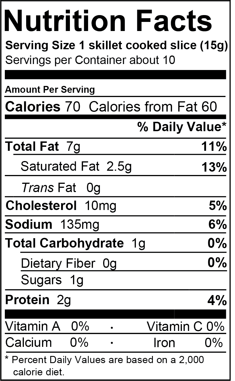Brined with a natural liquid cure. No Nitrites or Nitrates added.